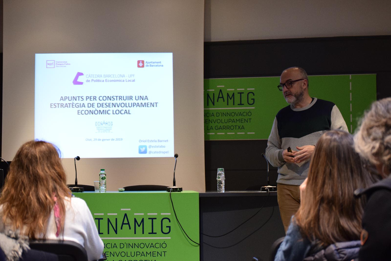 La conferència ha tingut lloc a les instal·lacions de l’Agència d’Innovació i Desenvolupament de la Garrotxa (DinamiG) davant d’una quinzena de persones de l’àmbit tècnic de l’agència, així com d’ADRINOC i l’Ajuntament d’Olot. La premissa de partida ha estat la necessitat d’analitzar les motivacions per intervenir en l’economia des de l’àmbit local (el per què) així com els objectius que es persegueixen amb aquesta intervenció (el per a què), per concloure que les respostes a ambdues preguntes es troben actualment molt condicionades per la procedència dels recursos disponibles per a les polítiques de desenvolupament econòmic local. Finalment, s’han exposat els instruments necessaris per trencar aquesta inèrcia: conèixer com funciona l’economia local, base fonamental per articular polítiques efectives, i les claus per construir una estratègia econòmica que atengui les tres dimensions del desenvolupament econòmic local (relacionar, posar en valor i atraure).
